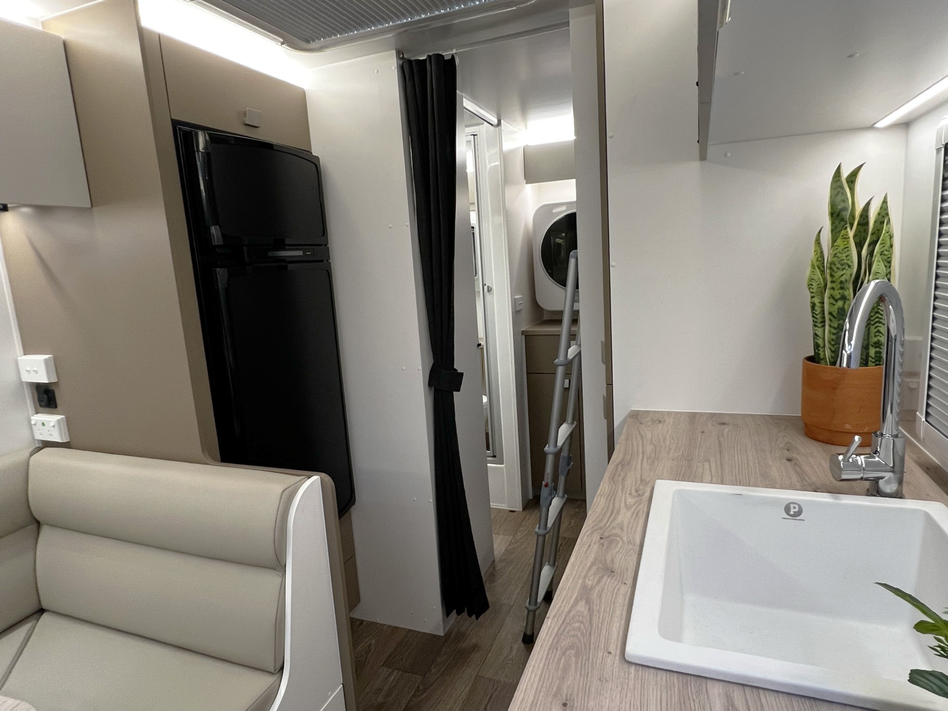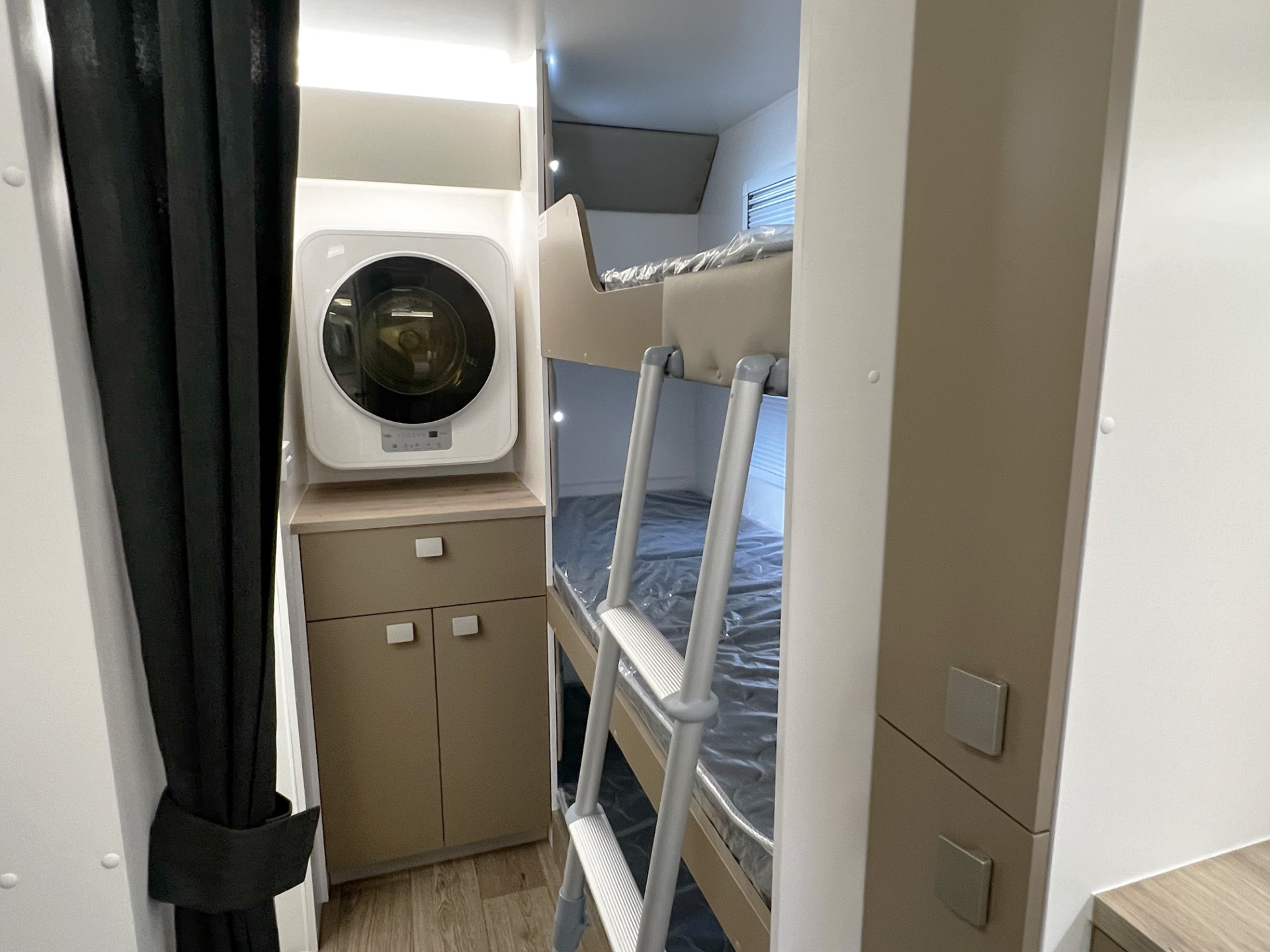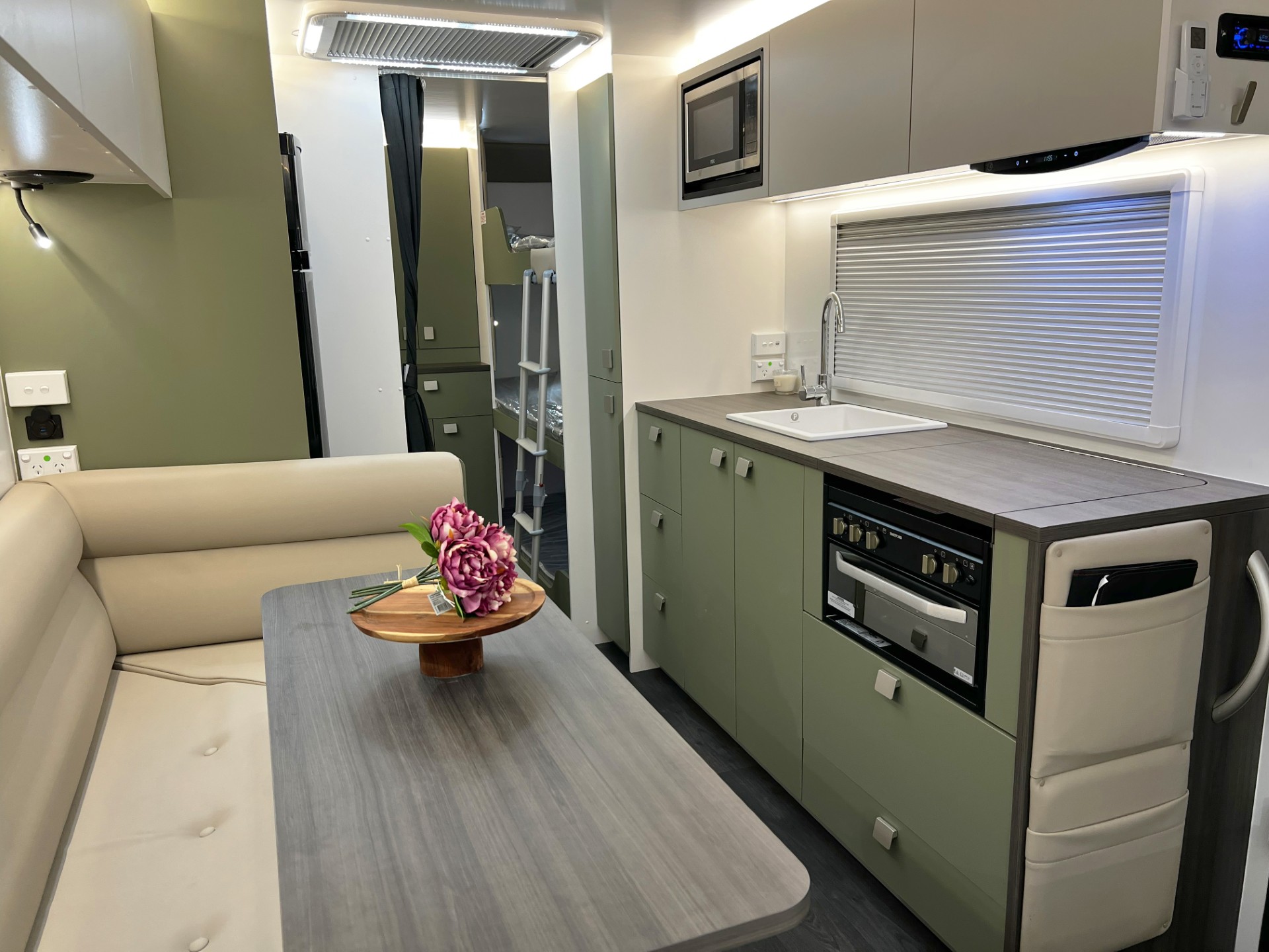 This year’s model introduces a new curved robe design, thicker 25mm benchtops, and a relocated kitchen and bunks to the doorside, maximising usability and flow. The toilet has been moved to the roadside for improved space distribution. Enjoy the convenience of internal and external USB-C charging, a modern single-bowl sink without drainer, and acoustic paneling for a quieter, more premium interior feel.