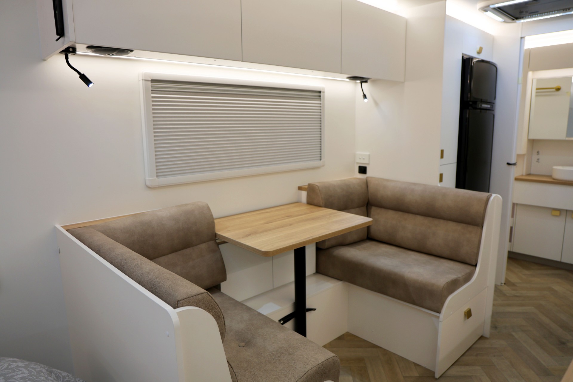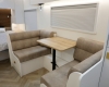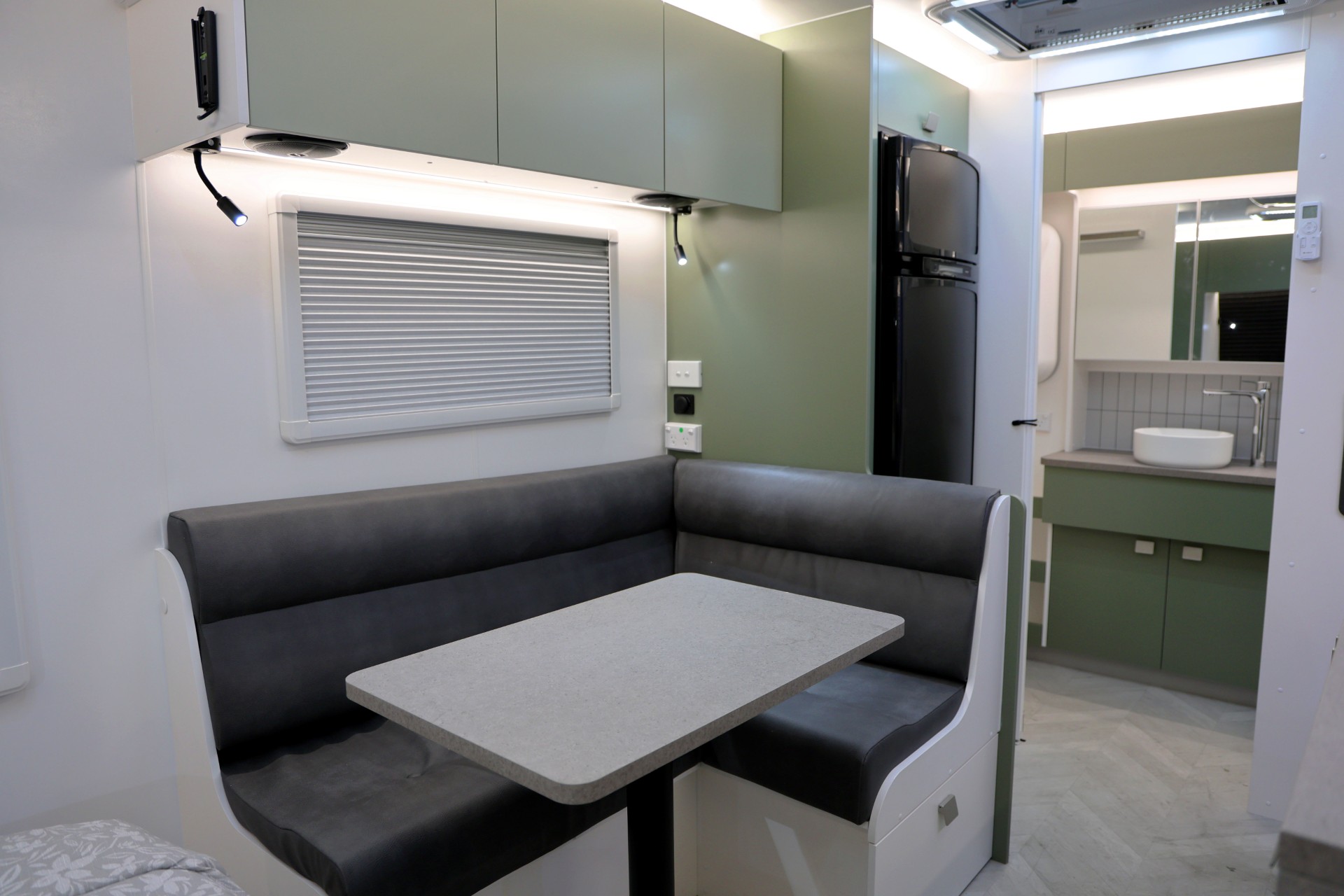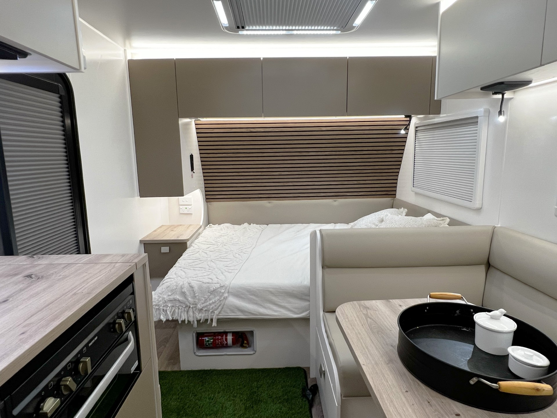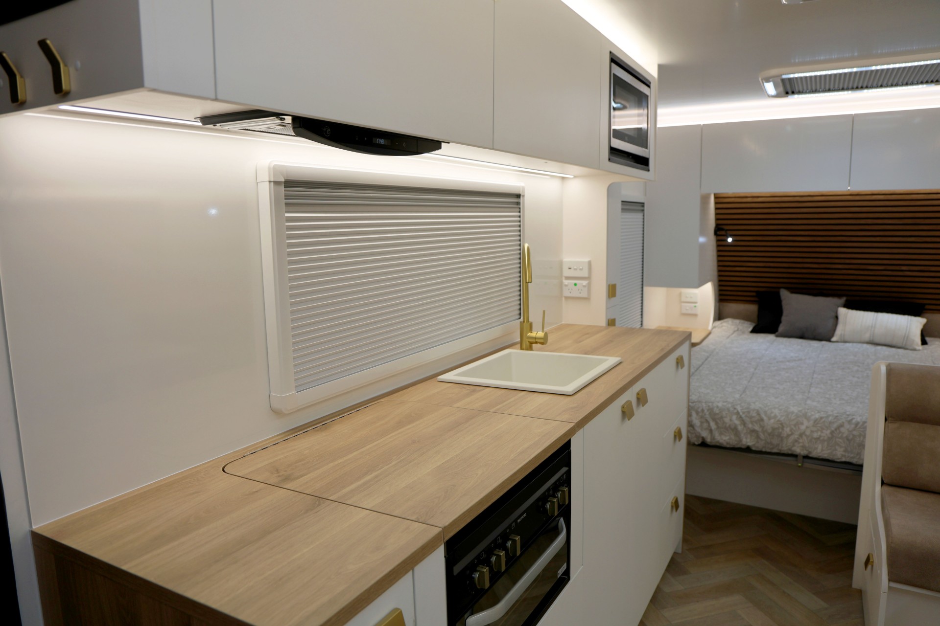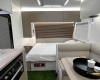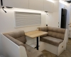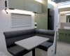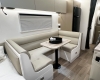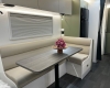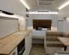 The new model features a curved robe, thicker 25mm benchtops, and a relocated kitchen for improved flow and functionality. The toilet has been repositioned to optimise interior space, while USB-C charging, a modern single-bowl sink, and acoustic wall panels enhance convenience and comfort.