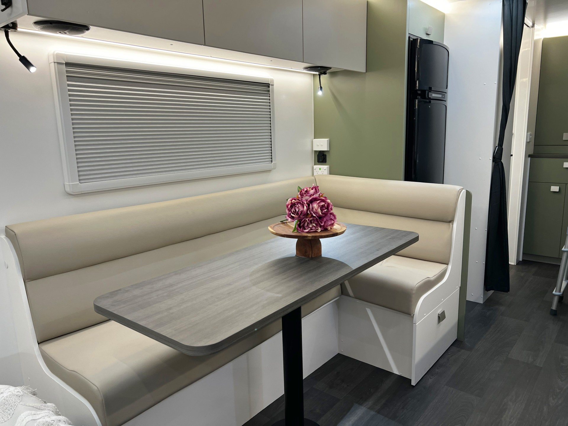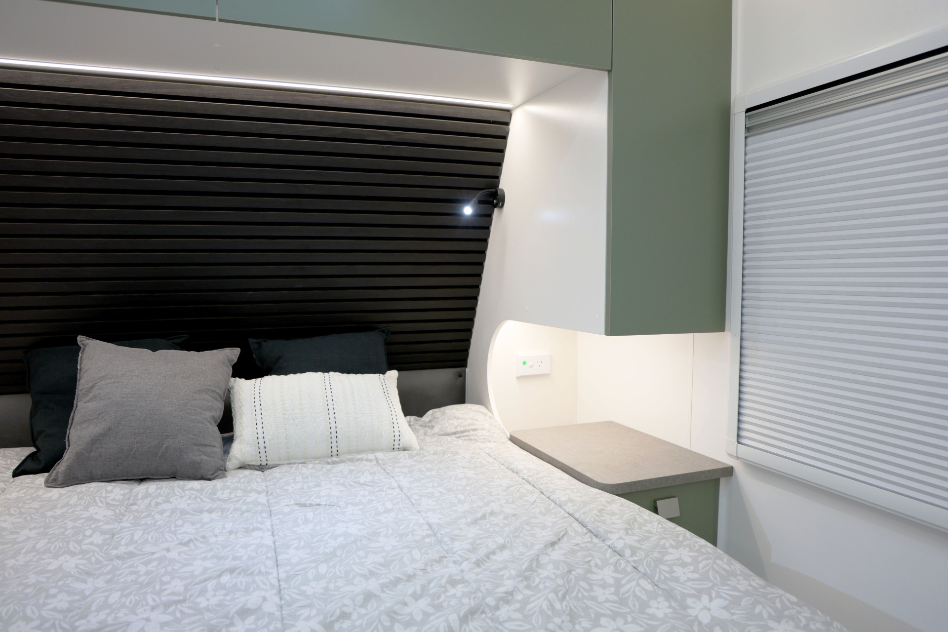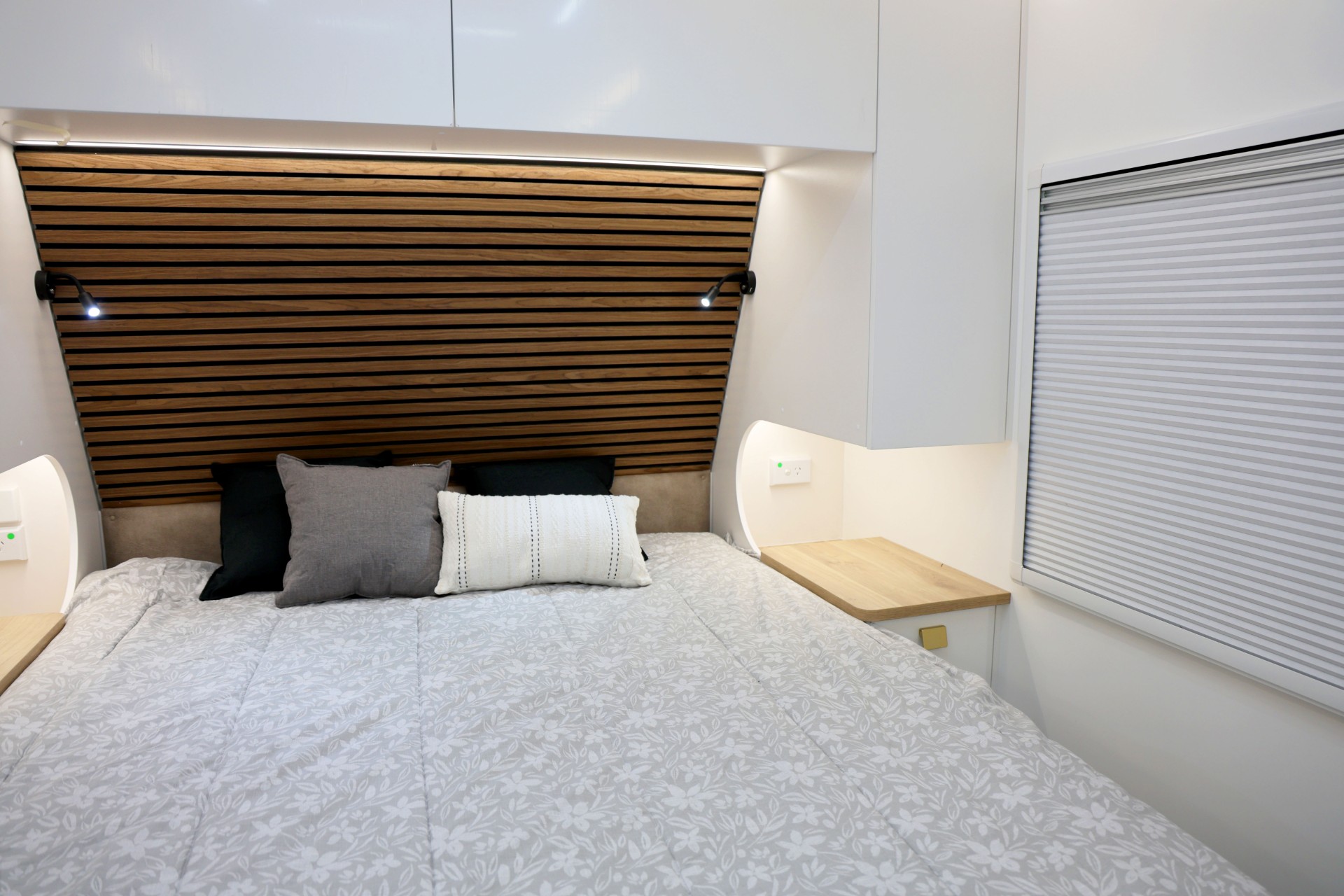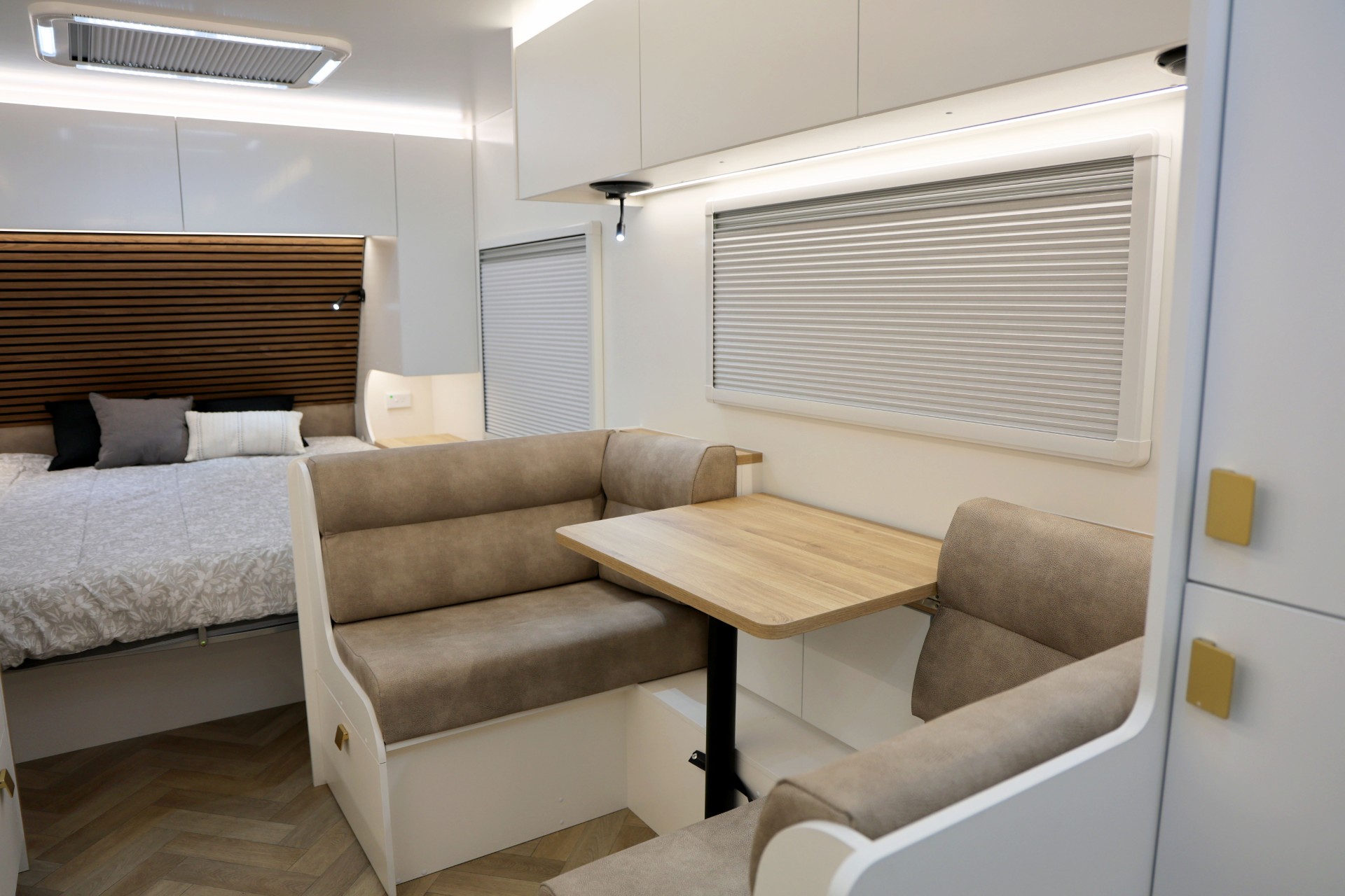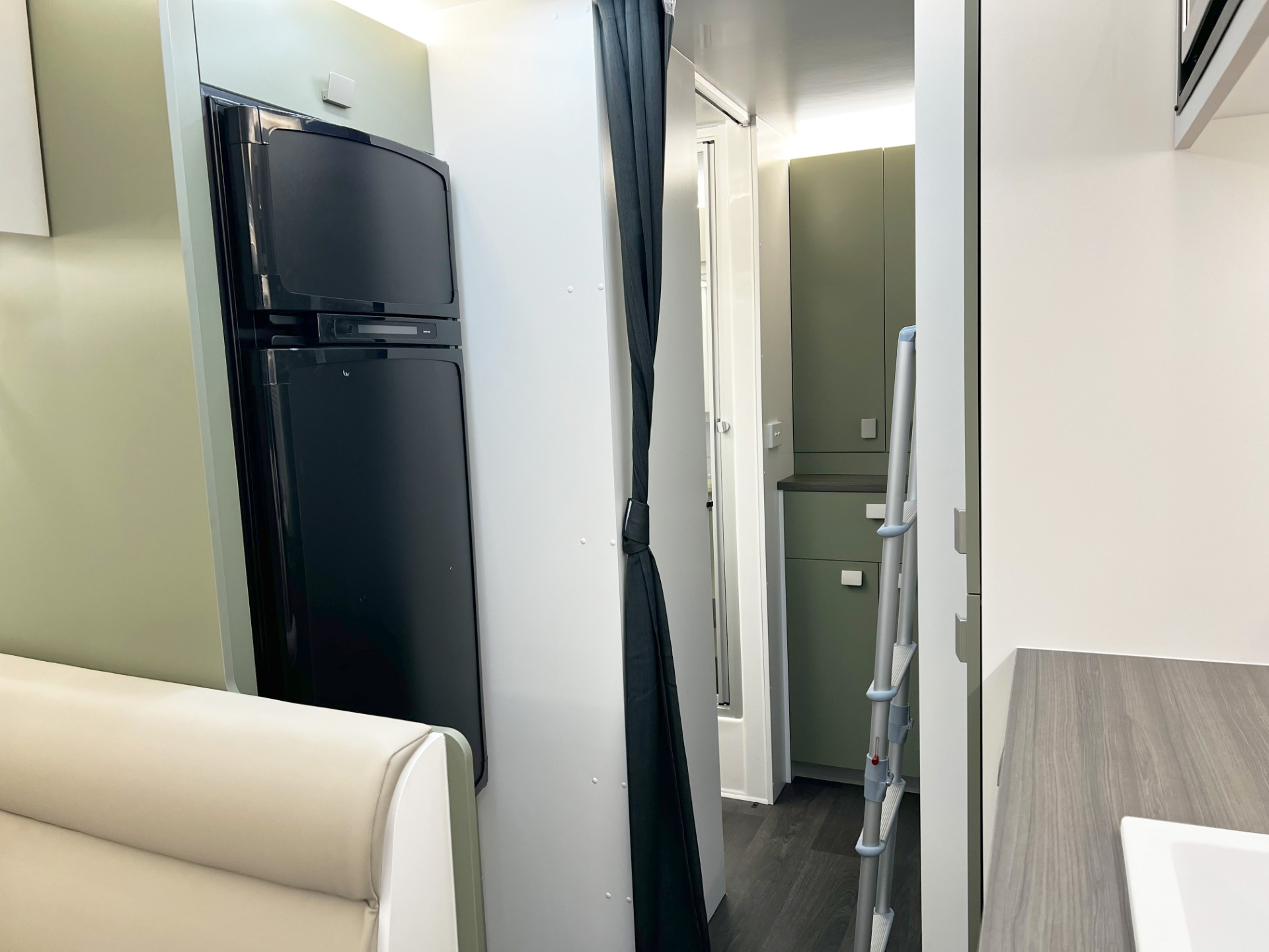 The new model features a curved robe, thicker 25mm benchtops, and a relocated kitchen for improved flow and functionality. The toilet has been repositioned to optimise interior space, while USB-C charging, a modern single-bowl sink, and acoustic wall panels enhance convenience and comfort.