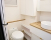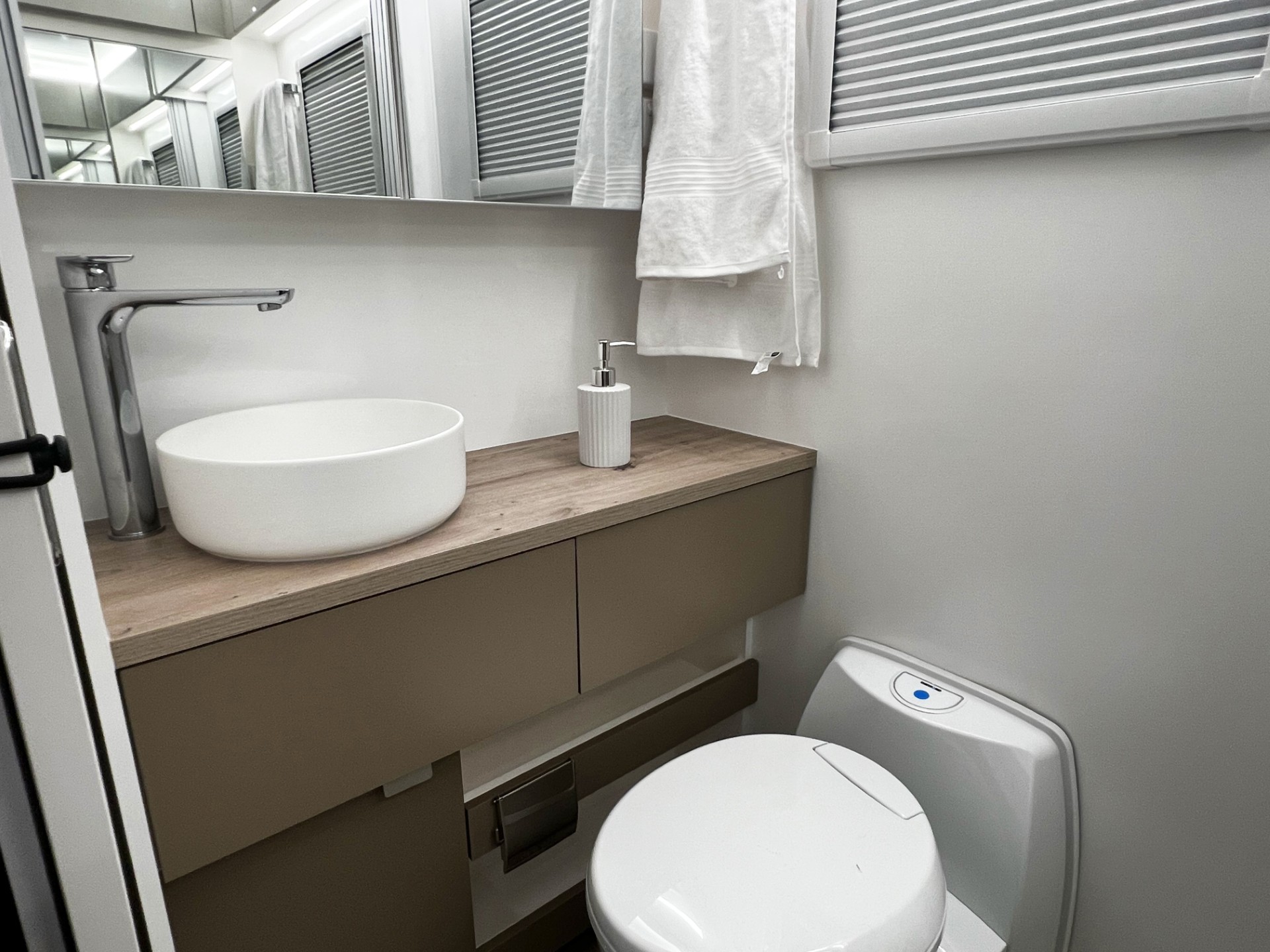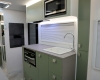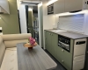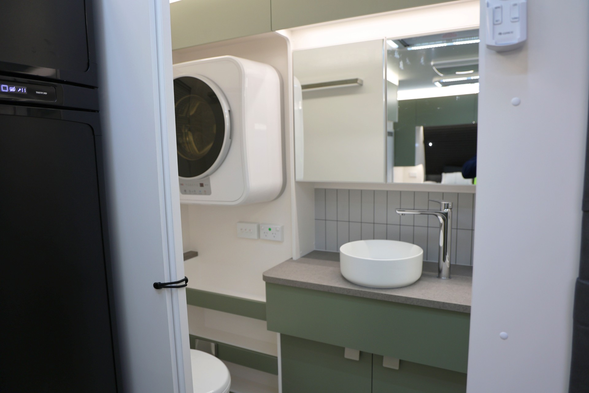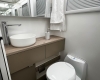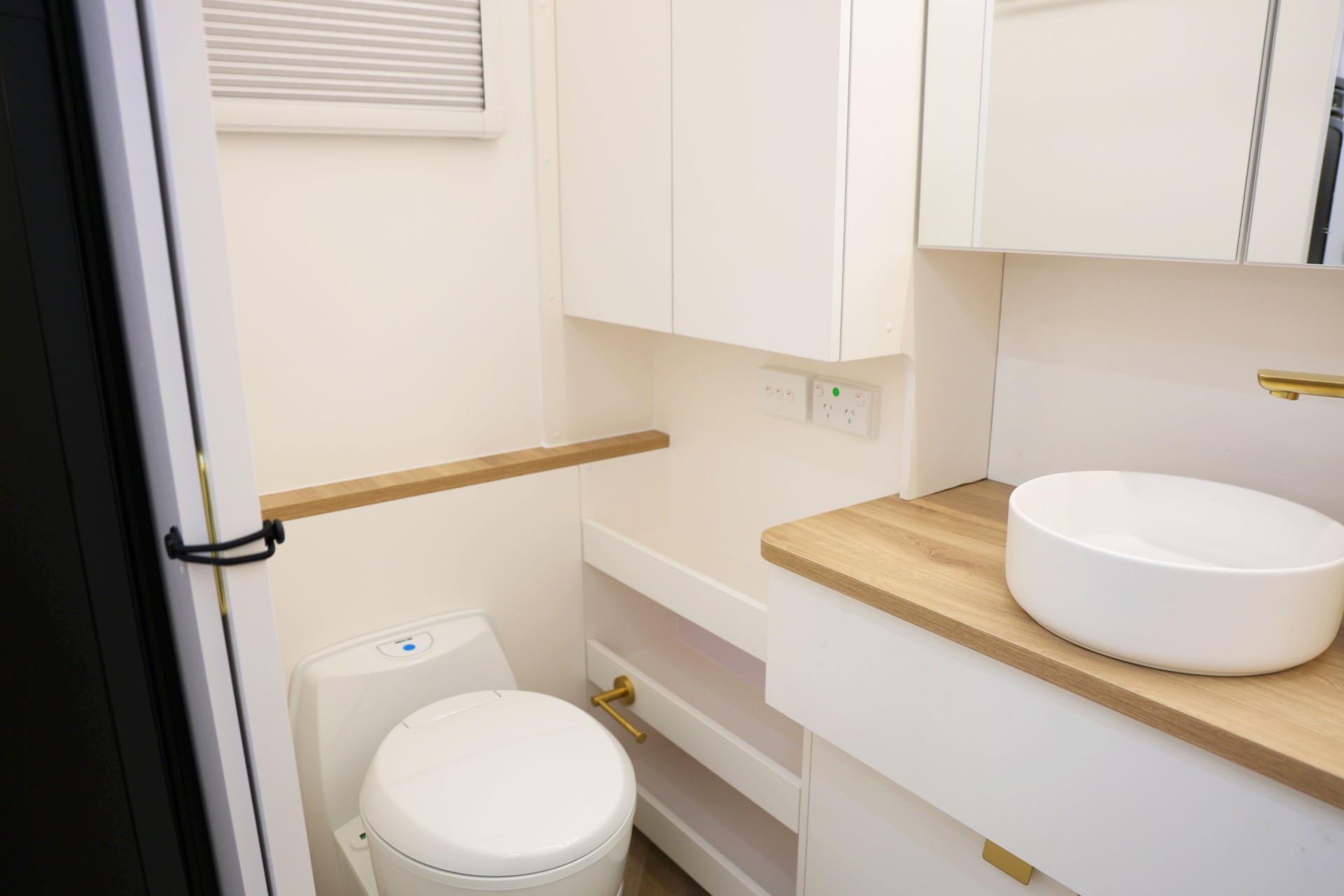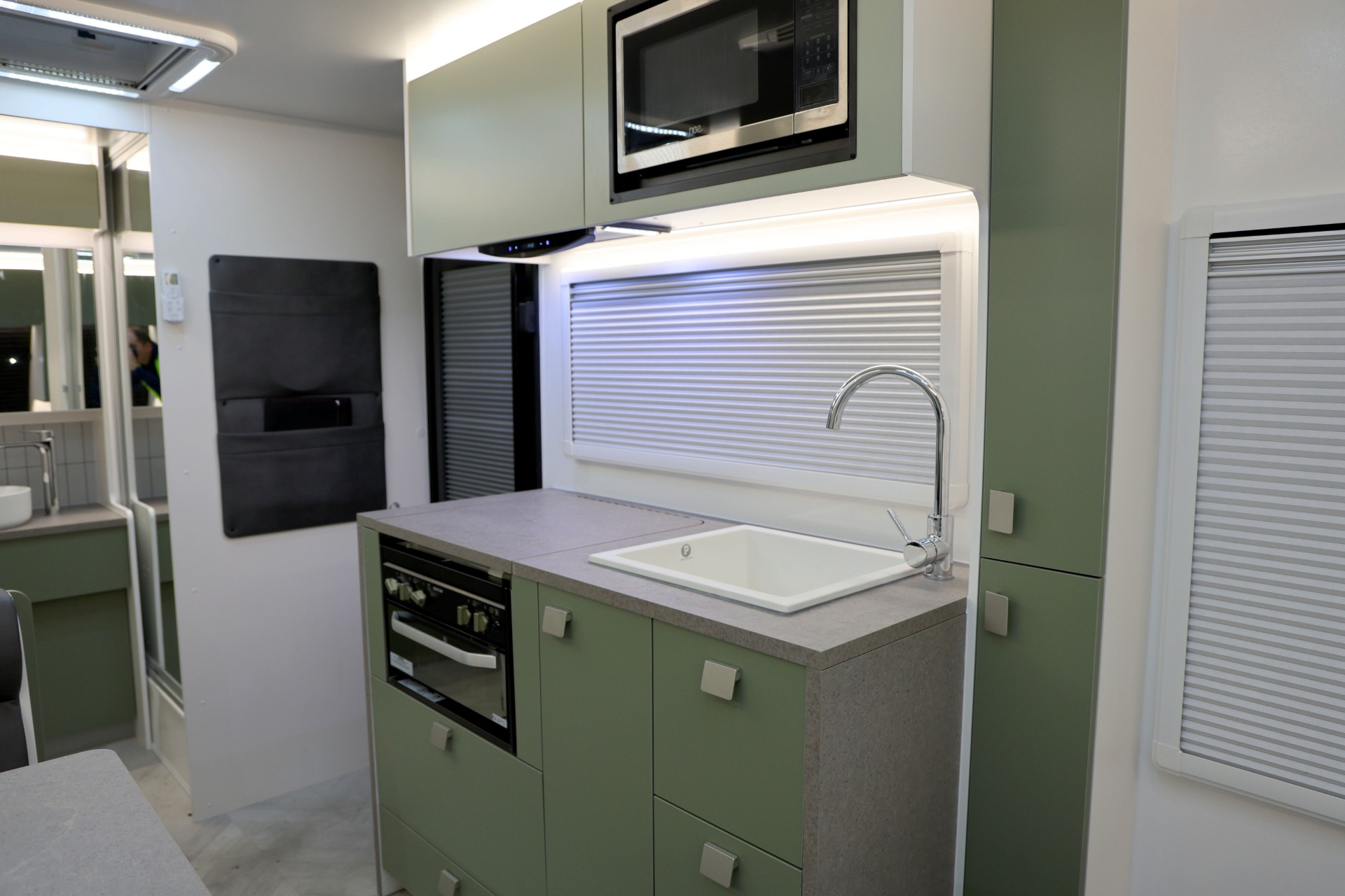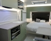 The new model features a curved robe, thicker 25mm benchtops, and a relocated kitchen for improved flow and functionality. The toilet has been repositioned to optimise interior space, while USB-C charging, a modern single-bowl sink, and acoustic wall panels enhance convenience and comfort.